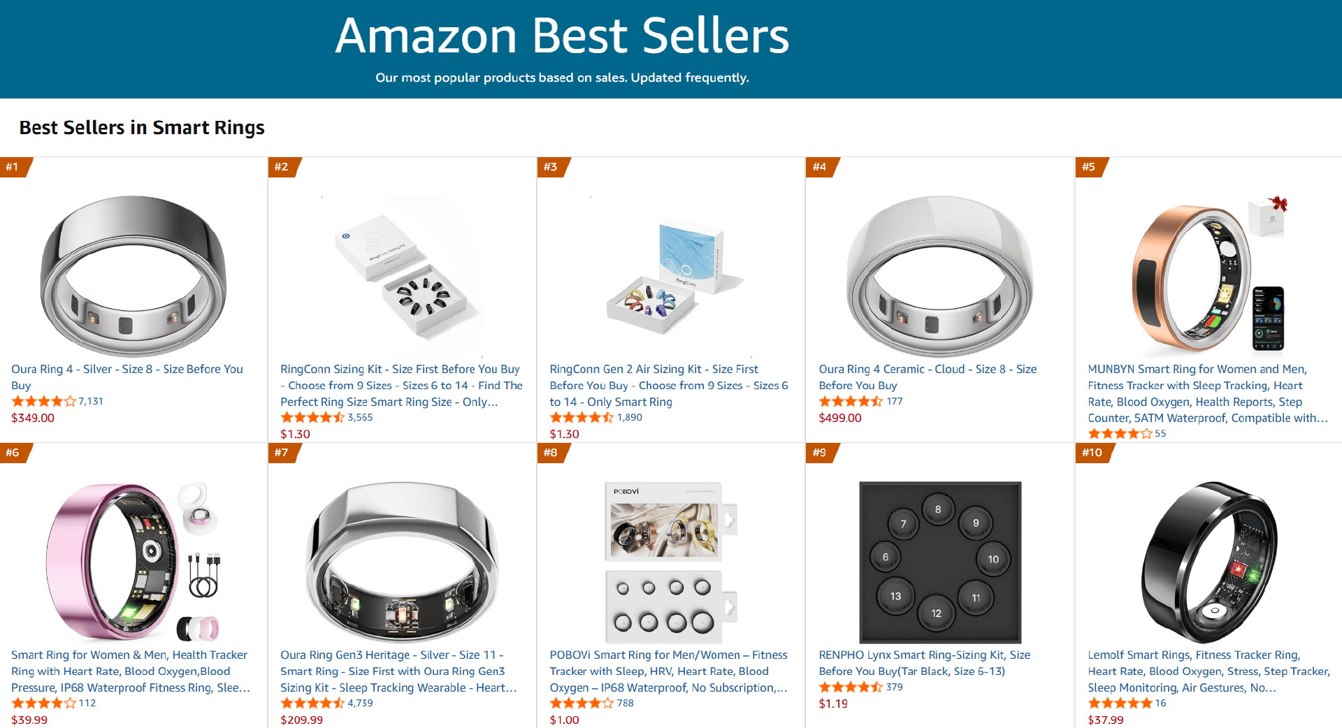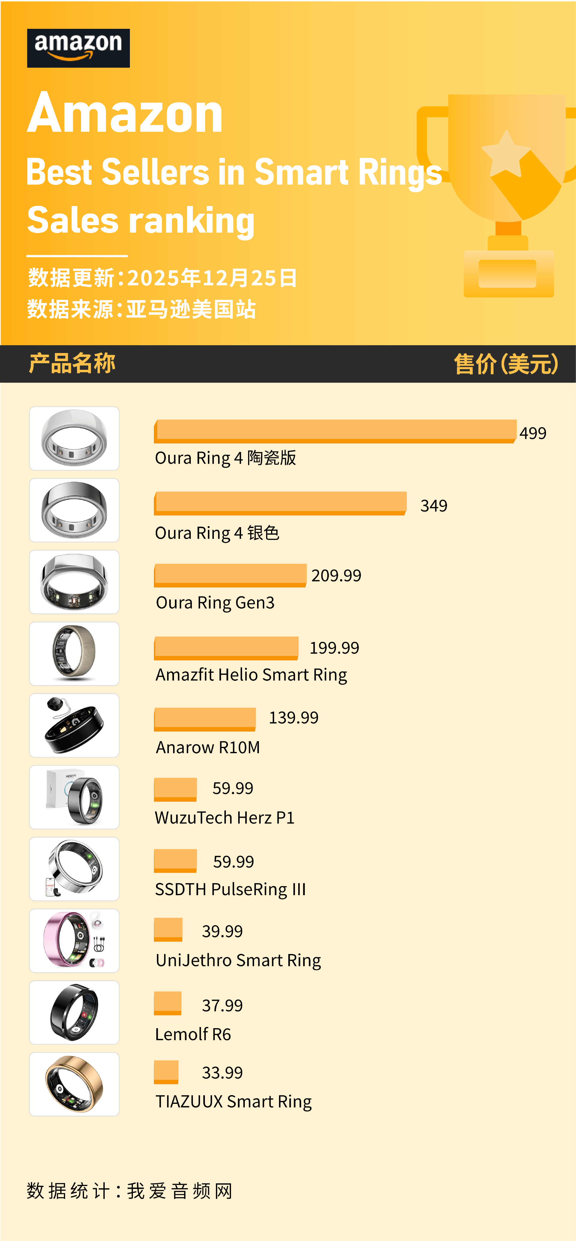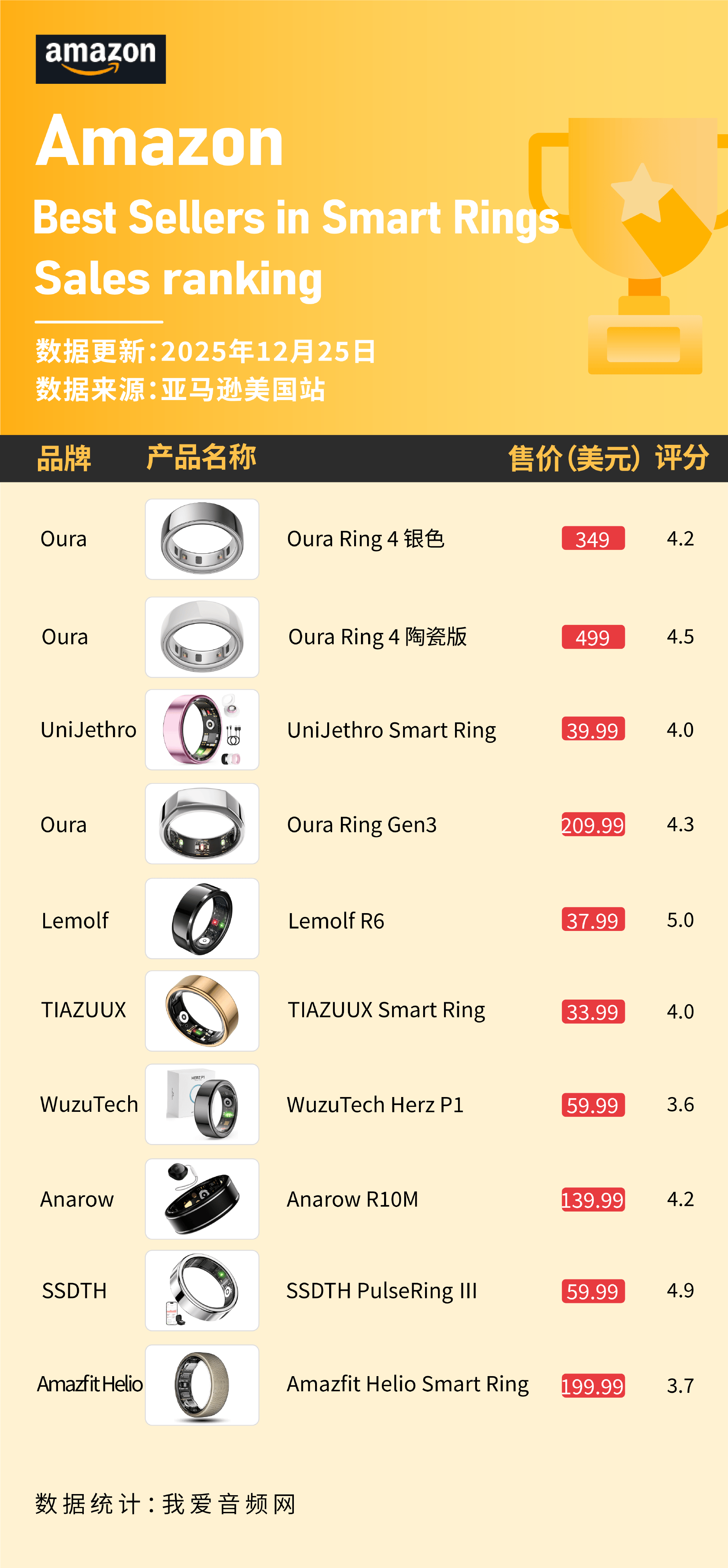 我爱音频网将从产品售价、产品口碑、产品互动量三个角度入手,去分析上榜智能戒指的产品特性与优势,以便更好地了解市场动态。以下数据截止至2025年12月25日,美国亚马逊智能戒指销售排行榜前十的产品(剔除智能戒指配件),本月还剔除了一款无货且看不到售价的产品,相关的产品价格、评分、互动量均以统计时的数据为准。