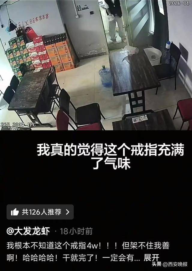 1月8日,视频发布者哈尔滨“大发龙虾”老板马先生告诉记者,事发时间为1月5日晚,顾客田女士在用餐结束后发现戒指不见了,随后,田女士和店员一起在餐厅内找了一个小时,“地面、桌面、垃圾桶、洗手间全找了,都没有。”田女士一度在店内崩溃大哭,店员让她先回家休息,等第二天来再继续找。