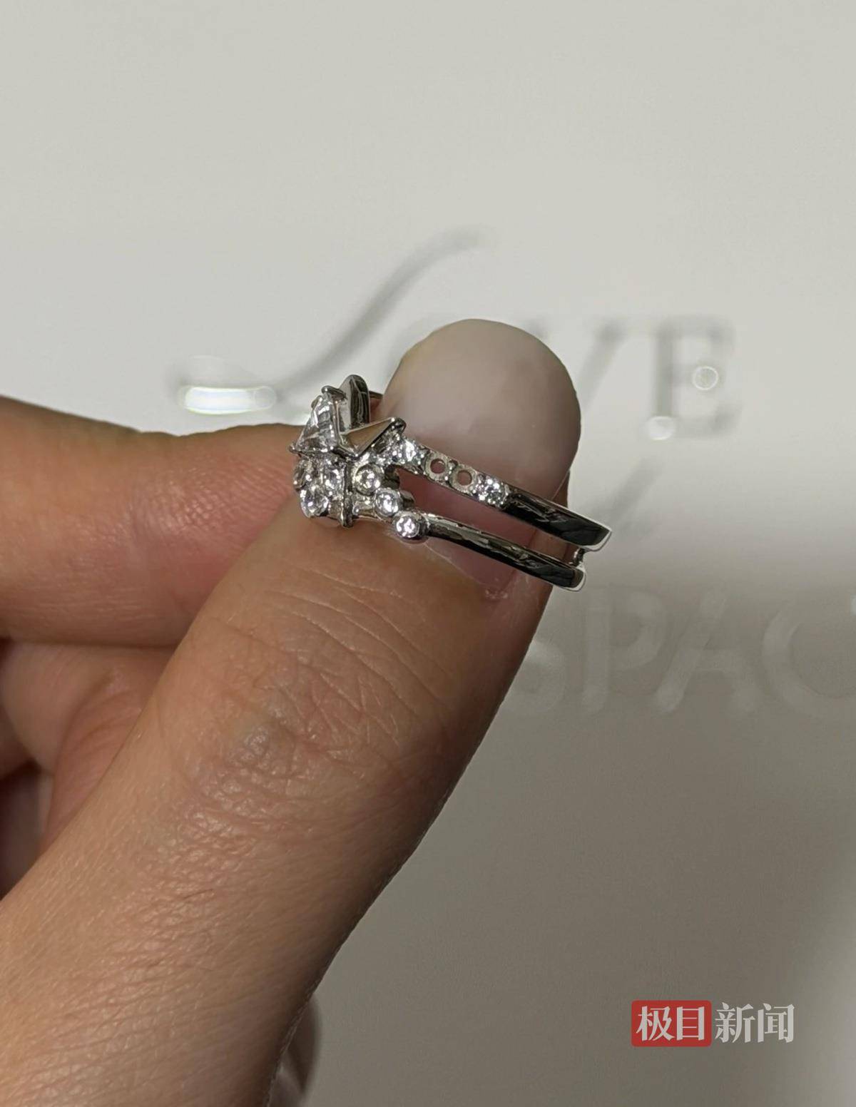 该玩家介绍,当时她没想太多,因为拿到的戒指是开口的,她直接调整了尺寸戴在手上,准备拍照发朋友圈,结果突然发现戒指上的钻已经掉了。