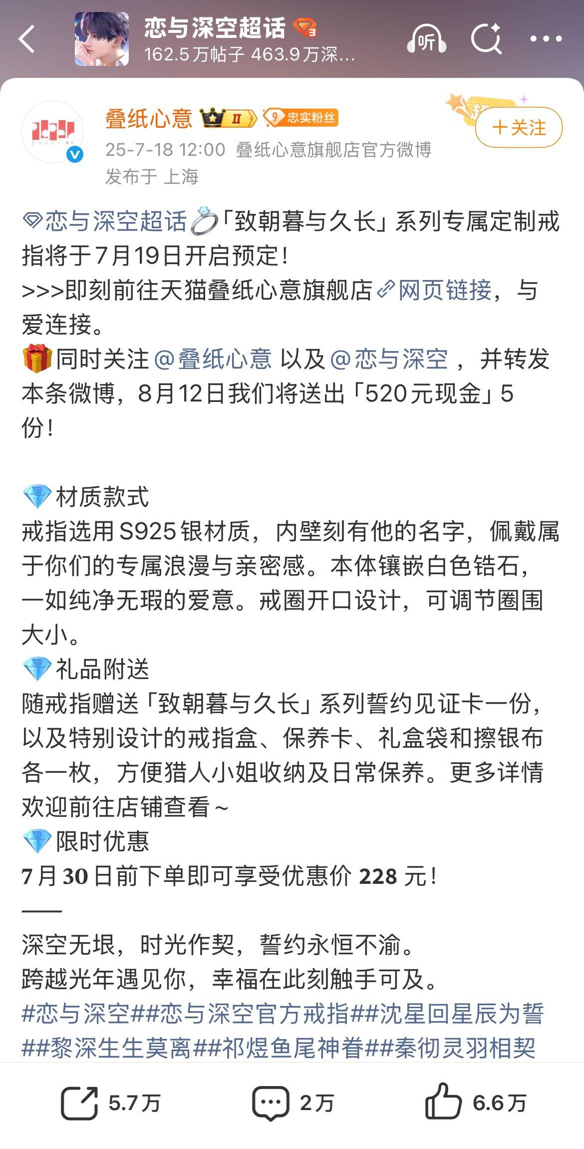 据了解,《恋与深空》是一款互动手游,由上海叠纸科技有限公司所开发。记者注意到,叠纸心意旗舰店为该公司售卖游戏周边的官方店铺。去年7月19日,上述游戏周边戒指正式开启预售。其官方微博在商品预售介绍中曾写道:“戒圈开口设计,可调节圈围大小。”