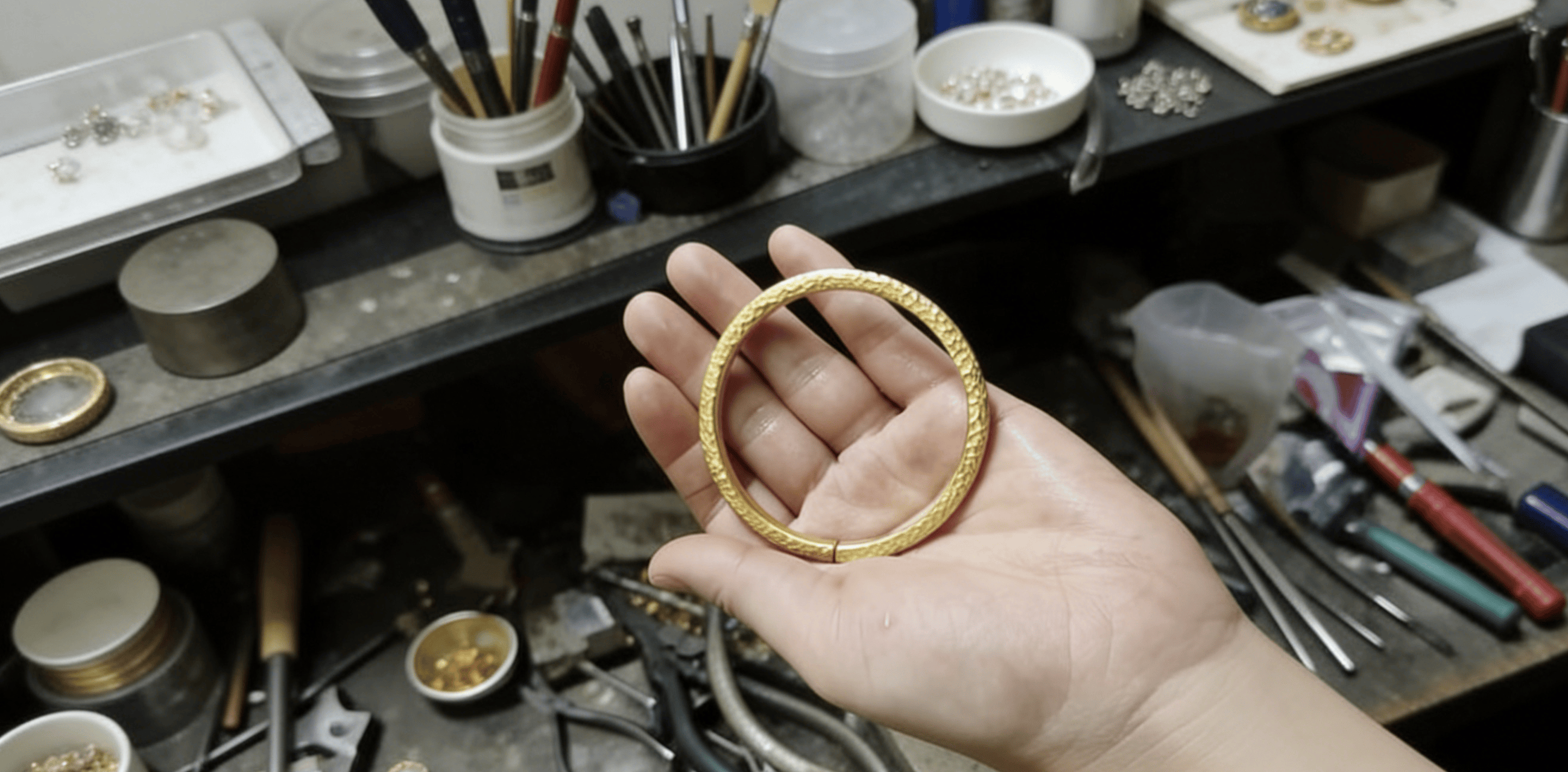 看准了这一市场空白,陈帆在义乌租下一间小工作室,作为线上运营的核心阵地,既用来拍摄产品视频、搭建直播间,同时也能接待零散客户。据他讲述,在创业初期,他主要做内容获客,线下则与义乌本地有十几年金银加工经验的老工艺厂达成合作,自己负责前端的流量运营、产品设计和订单对接,工厂则按照他的工艺要求完成金包银饰品的生产制作。