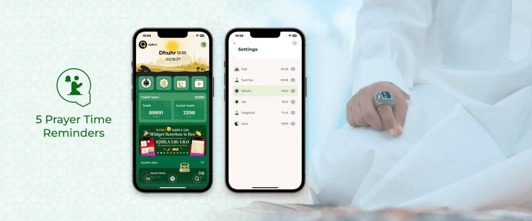 由于礼拜时间随太阳运行角度每日微变,精准的时间控制是生活的底层刚需。Time Reminders结合用户实时经纬度,通过天文算法自动更新每日五次礼拜的精准时刻。相比于手机闹钟的嘈杂,戒指的指间震动更加私密且庄重,避免了在工作会议或公共场合产生不必要的打扰,确保用户在忙碌的现代生活中依然能保持与宗教节律的同步。