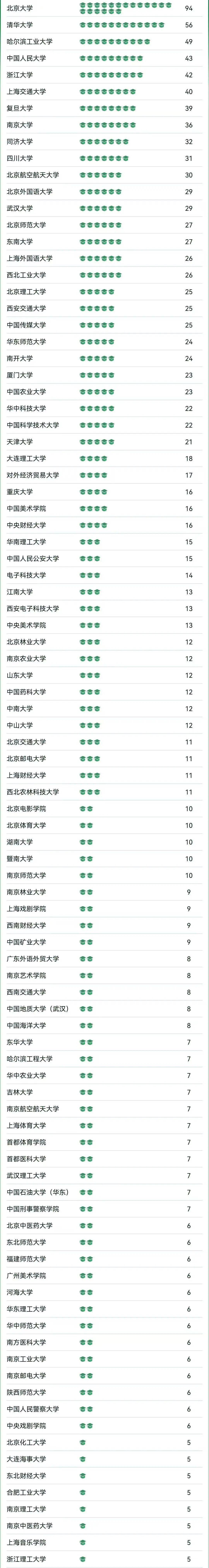 榜单后端多为专业的特色院校以及地方重点高校,得分大多在5-10分的区间内,这样的分数在这一类院校里并不算高,但它们却能在全国范围内排进前80名,这些院校有实力在某一方面做到专业,例如一些艺术类院校的得分就比较明显,像中国美术学院(16分)、中央美术学院(13分)、北京电影学院(10分)等,可见这个评价涵盖了很宽泛的领域。
