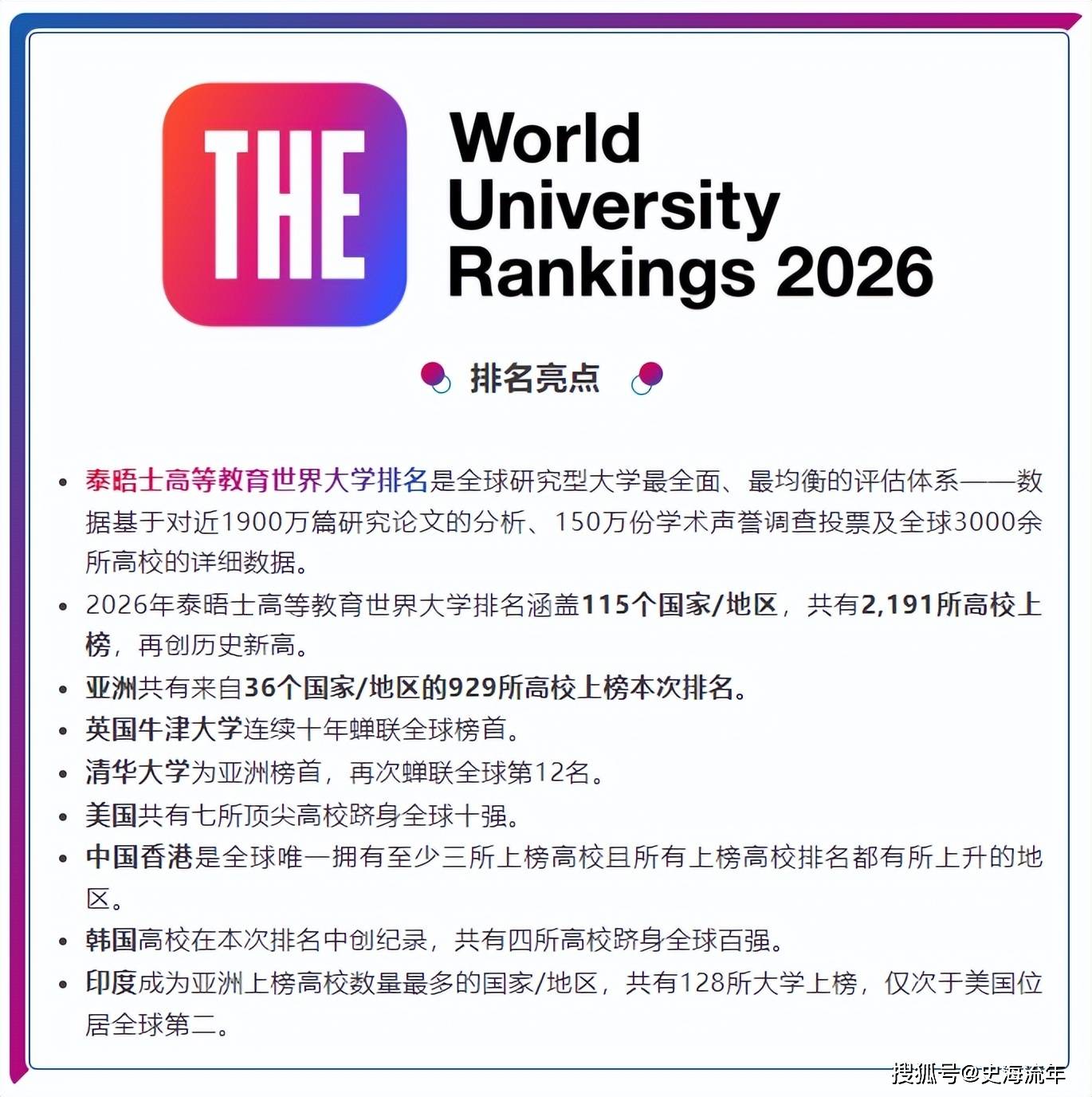 2026年THE排名中的突破,标志着中国高等教育已进入全球竞争的中上游阵营。但从“大而强”到“精而优”的跨越,仍需在特色发展、国际化深化、成果转化与治理改革等方面持续发力。随着中国高等教育质量的系统性提升,未来必将在全球学术版图中占据更重要的位置。返回搜狐,查看更多