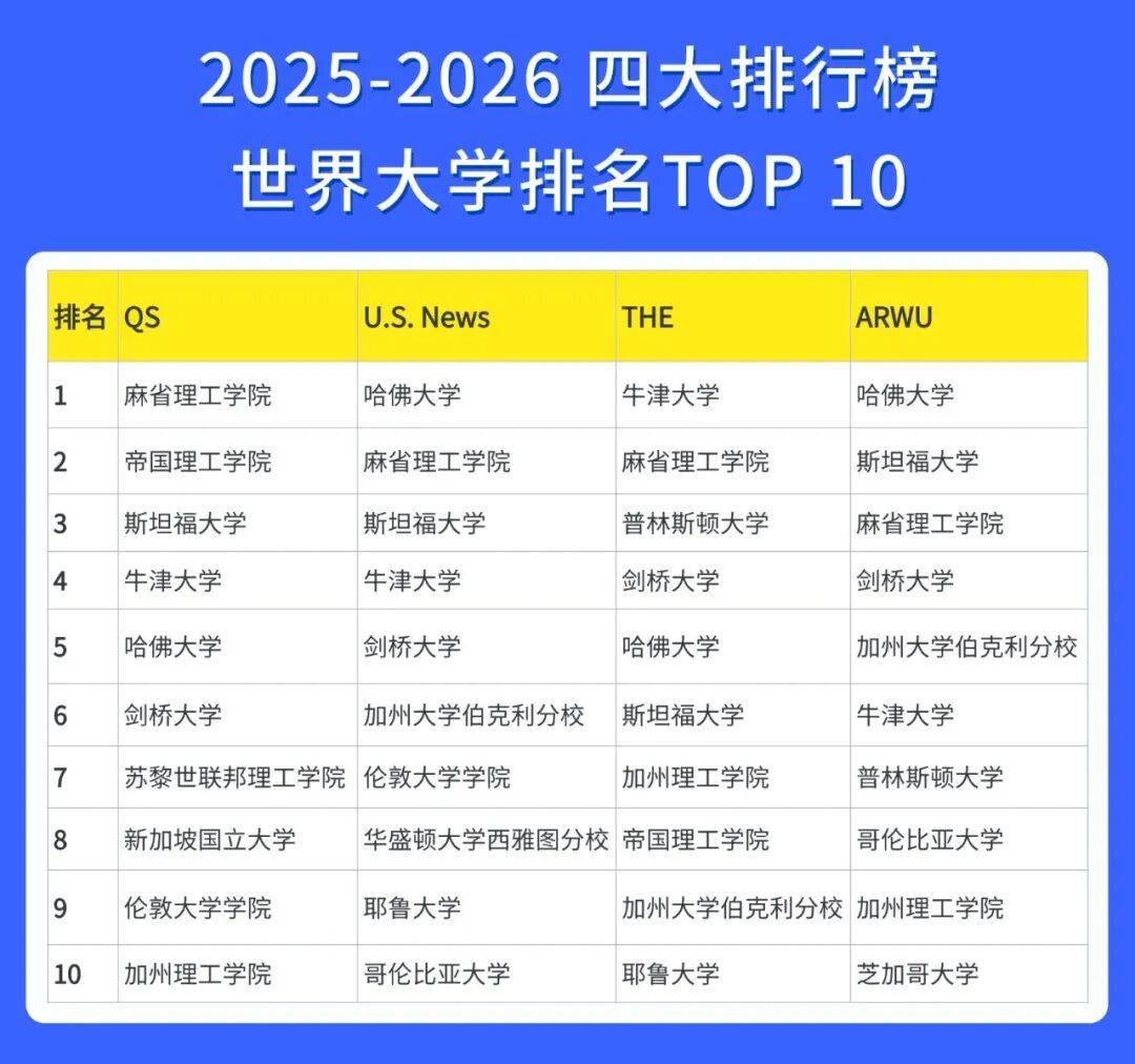 在四大权威榜单中均稳居top 10的高校包括:麻省理工、伟德国际吧哈佛、斯坦福、牛津与剑桥。无论各类排名标准如何调整,这些学府始终凭借其顶尖的学术实力,获得广泛公认。