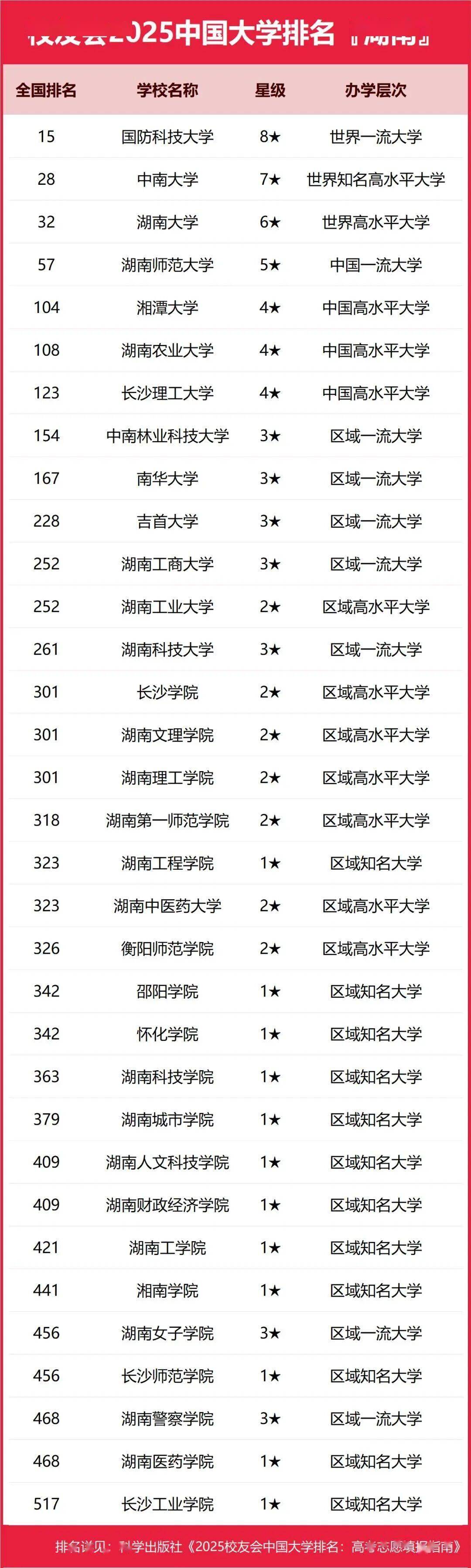 校友会2025中国大学排名揭晓,湖南省高校版图呈现新格局。国防科技大学以世界一流大学的雄厚实力蝉联榜首,中南大学、湖南大学分别以医学与土木工程等优势学科稳居第二、伟德国际victor1946第三梯队。湖南师范大学凭借师范教育与人文社科领域的突出表现,稳坐省内第四位置。伟德国际victor1946湘潭大学、湖南农业大学、长沙理工大学等高校在学科建设与服务地方经济方面成效显著,稳居全国百强行列。