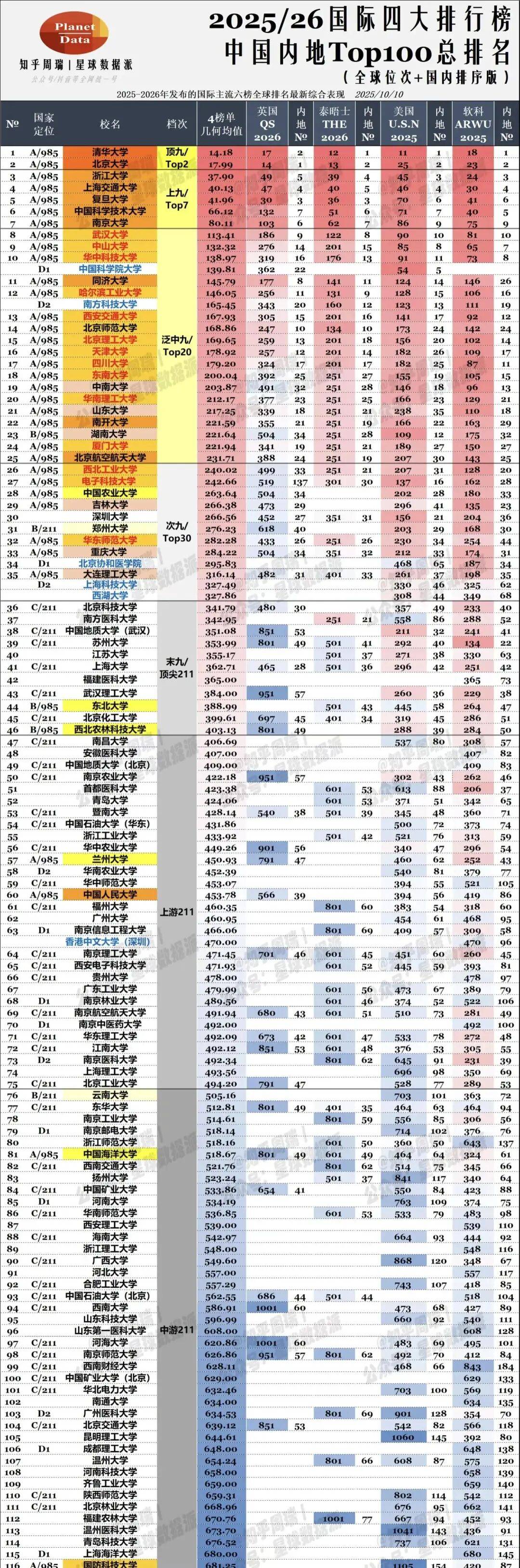 根据星球数据派整理2025年至2026年世界四大排名机构发布的排行榜,并取四大机构的平均值作为排名标准,具体来看看中国高校内地高校100强的情况。