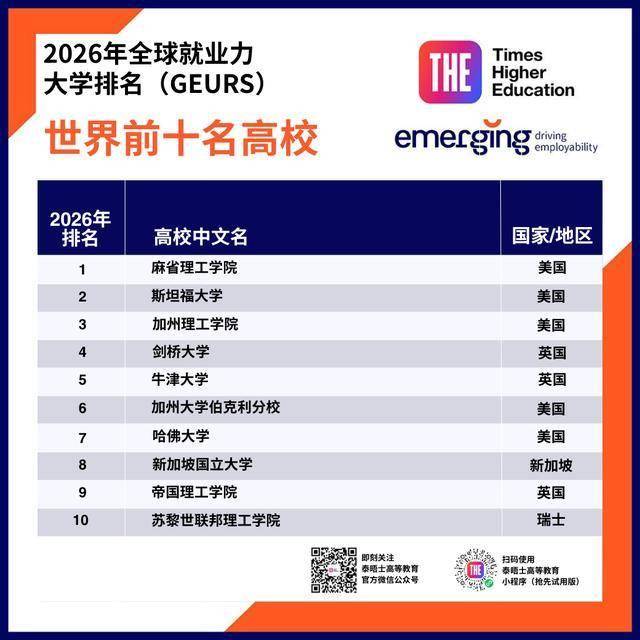 由法国咨询公司Emerging收集数据,并与泰晤士高等教育(THE伟德国际1946)共同发布的全球就业力大学排名(GEURS)揭示了全球顶尖企业招聘官心目中最能培养学生职场竞争力的大学榜单。