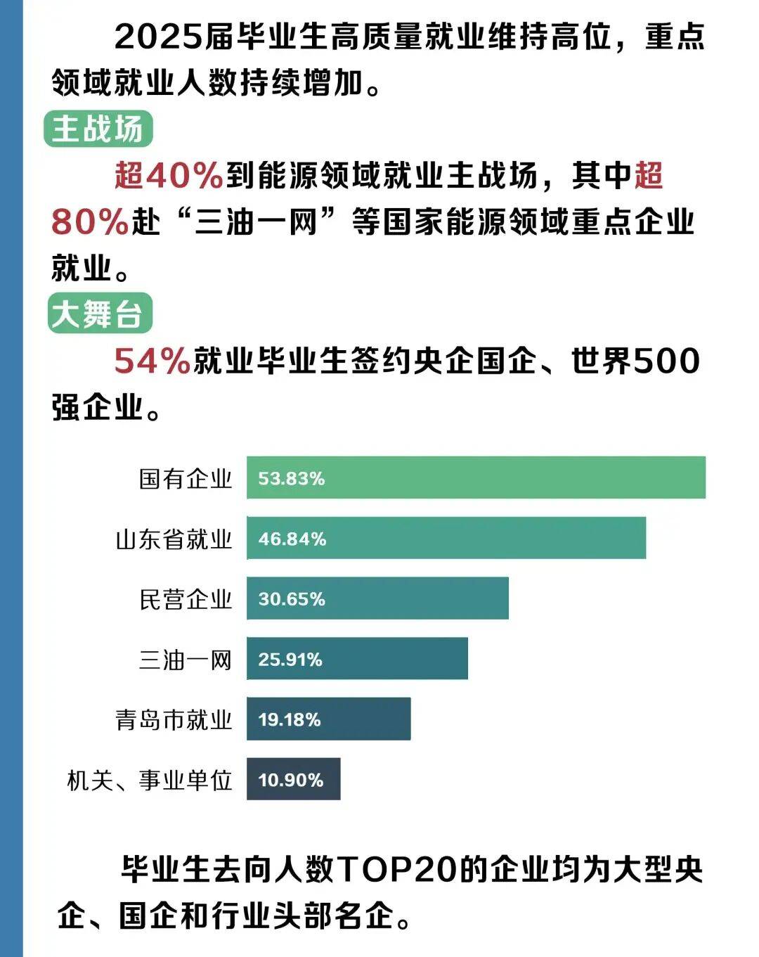 大家或许觉得石油类高校已经出现没落,没有计算机或者电子信息等专业容易就业。据学校发布的2025届高校毕业生就业报告,毕业生里面有53.83%到国有企业工作,10.9%的毕业生到国家等政机关的事业单位工作。