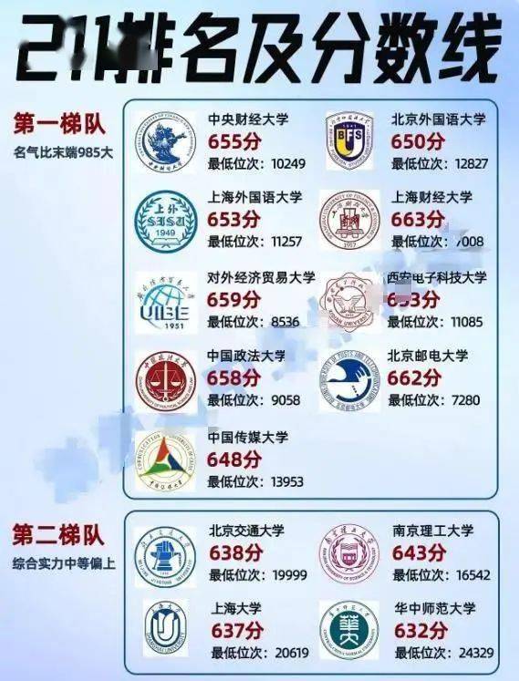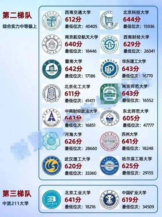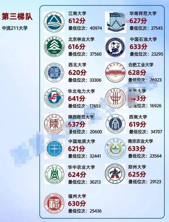 再来看第三梯队,综合实力中等的中流211大学,和第一第二梯队相比,第三梯队的211大学录取分数线较低,学生考上的可能性更大。