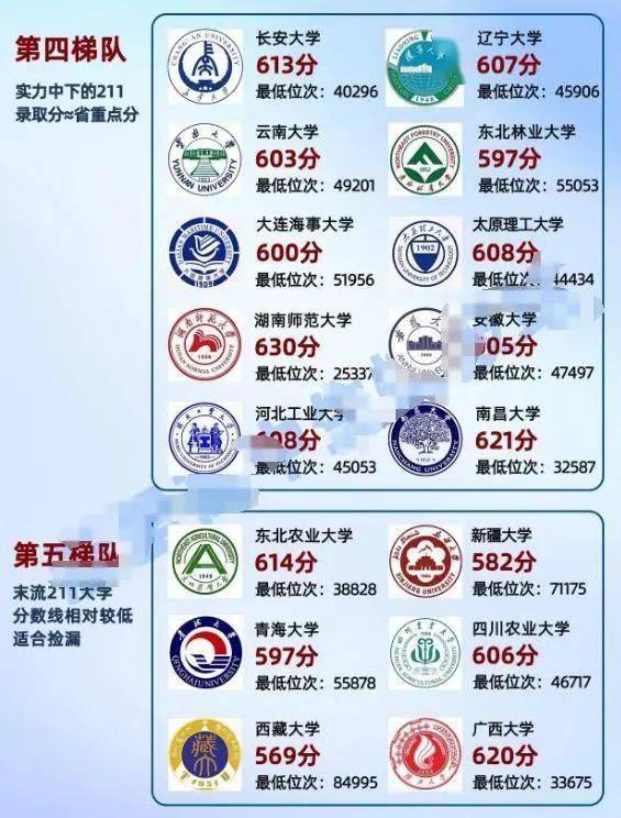 最后是第五梯队末流211大学,这些211大学综合实力相对较弱,录取分相对较低,也更适合学生捡漏。