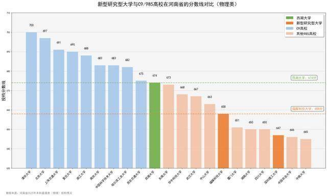 新型研究型大学与C9/985高校在河南省2025年本科普通类(物理)分数线对比图