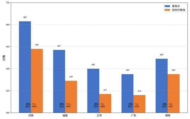 在河南省录取的最高分达683分,位次857,最低投档线,最低投档线,最低投档线。在广西壮族自治区物理类最低投档线,超越北京师范大学、华南理工大学、厦门大学等多所名校;江西省物理类最低投档线,高于哈尔滨工业大学、山东大学、湖南大学等985名校。