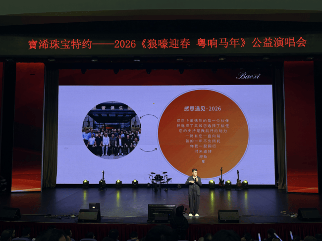 2026 年这场公益演唱会,正是宝浠珠宝扎根本土、践行公益的十年初心之约。 2026 年 2 月 8 日,广州四会剧院灯火璀璨,由由广州皇钻珠宝有限公司旗下品牌 “宝浠” 珠宝独家冠名、陆鹏毅先生倾力打造的《狼嚎迎春・粤响马年》公益演唱会在此温情开演,多家单位联合赞助支持,为观众献上了一场兼具视听享受与公益温情的音乐盛宴。现场不仅准备了丰富的入场伴手礼,更设置了惊喜抽奖环节,让观众在感受港乐魅力、体悟公益初心的同时,收获满满惊喜,尽兴而来,满载而归。