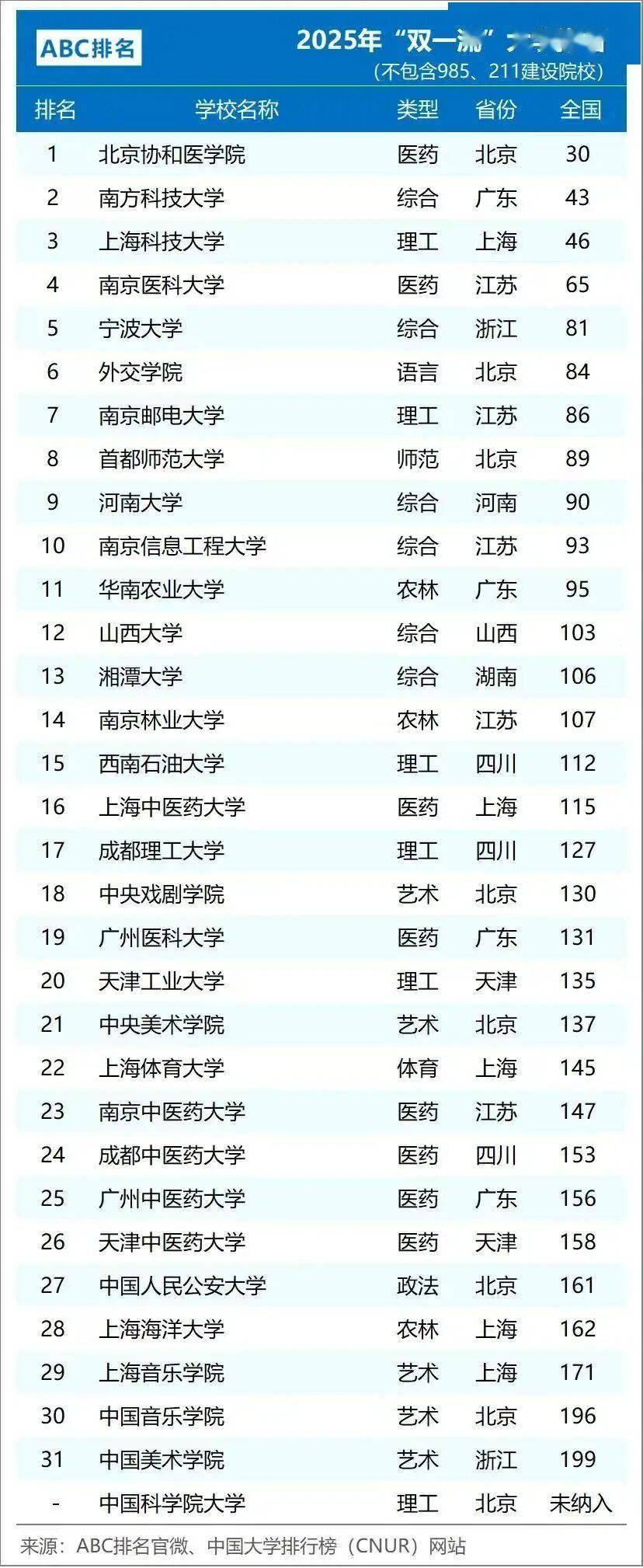 前三分别是北京协和医学院、南方科技大学和上海科技大学,分别排在全国总榜第30名、第43名和第46名。