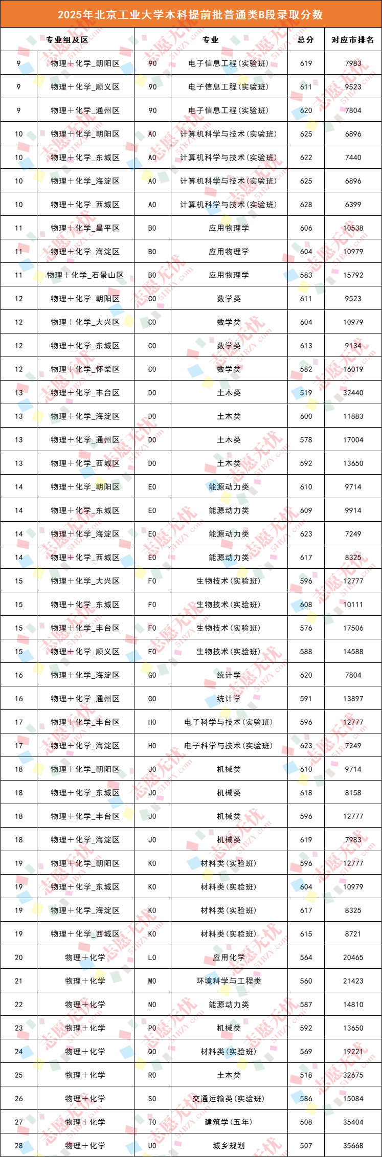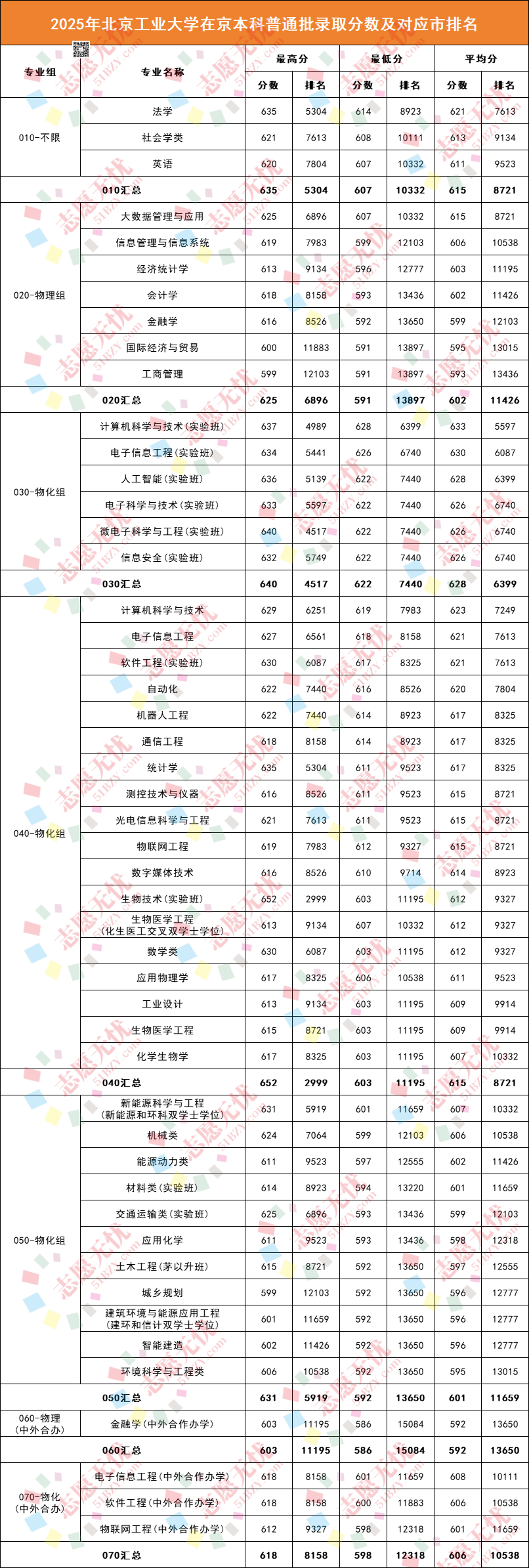 030-物化组为2025年首次推出的由实验班组成的火箭组,最低分为622分,比北京特控线-物化组(普通工科大类) 是招生专业最多、覆盖面最广的组别。最低分普遍在603分(对应市排名11195)以上,如计算机科学与技术(非实验班)最低分619分(排名7983),软件工程(实验班)最低分617分(排名8325),通信工程、自动化、机器人工程等专业也表现不俗。部分专业如生物技术、生物医学工程(普通)、化学生物学等专业最低分在603-607分区间。