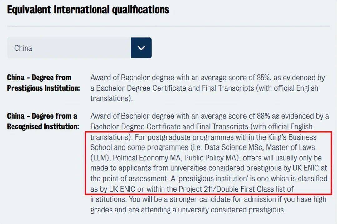 在同等条件下,伦敦国王学院仍然更倾向于录取具有“985”“211”院校背景的学生。