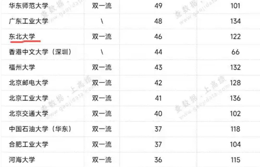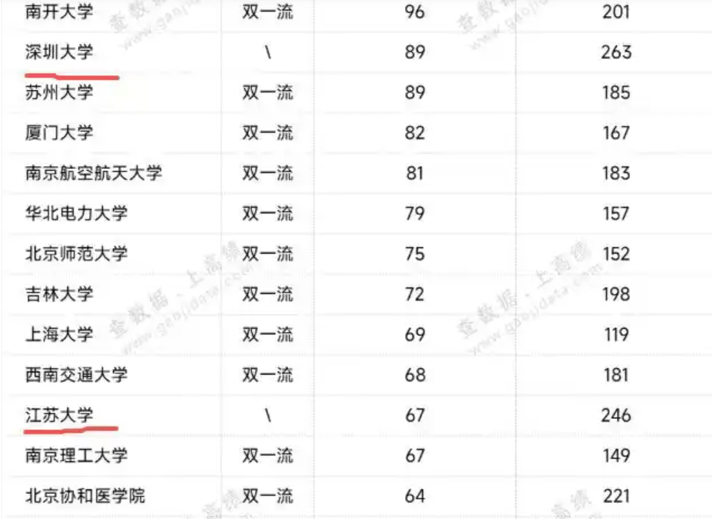 这次榜单中一个可喜的现象是四非高校表现突出,深圳大学、江苏大学、广东工业大学、浙江工业大学等校的入选人数超过了很多双一流高校。