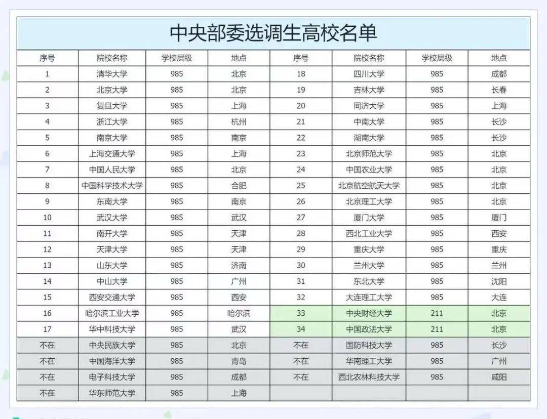 2025中央部委选调生高校名单,仅34所大学入选,这7所985也惨遭淘汰