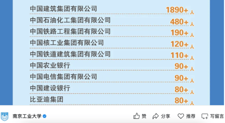 南京工业大学一直都比较低调,但作为一所传统的工科强校,学校实力与毕业生就业情况一直都不错,毕业生有30%都能进入国有企业就业,2024届有大几千人进入中国建筑集团、中国石油化工集团、中国铁路工程集团等世界500强企业就业。