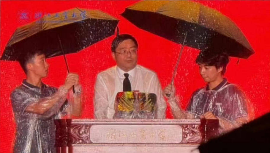 9月3日晚,浙江工业大学举行2025级本科生开学典礼,没想到天降大雨,高翔拒绝了雨衣,冒雨致辞,两名新生自发上台为校长打伞,没想到因为默契不够,导致雨水恰好从雨伞中间缝隙流下,将高翔“浇透”。bv1946伟德国际始于英国这个画面被网友戏称为“双一流”。