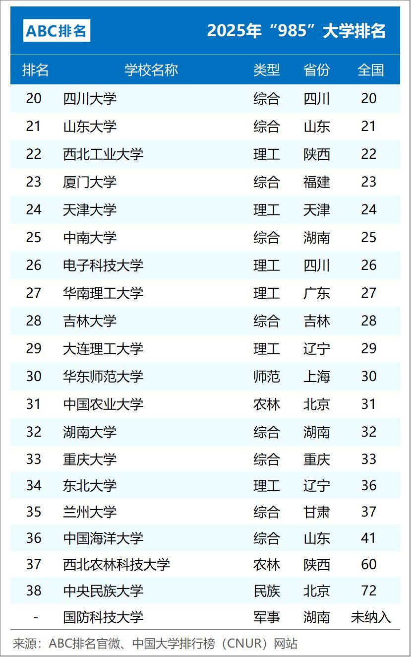 总之,2025年的高校排名充分展现了我国985高校群星璀璨、各有所长的特点。我们有理由期待,这些顶尖学府能够继续发挥引领作用,为国家繁荣和民族复兴贡献更大的力量。返回搜狐,查看更多