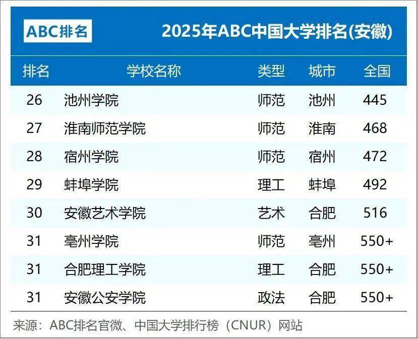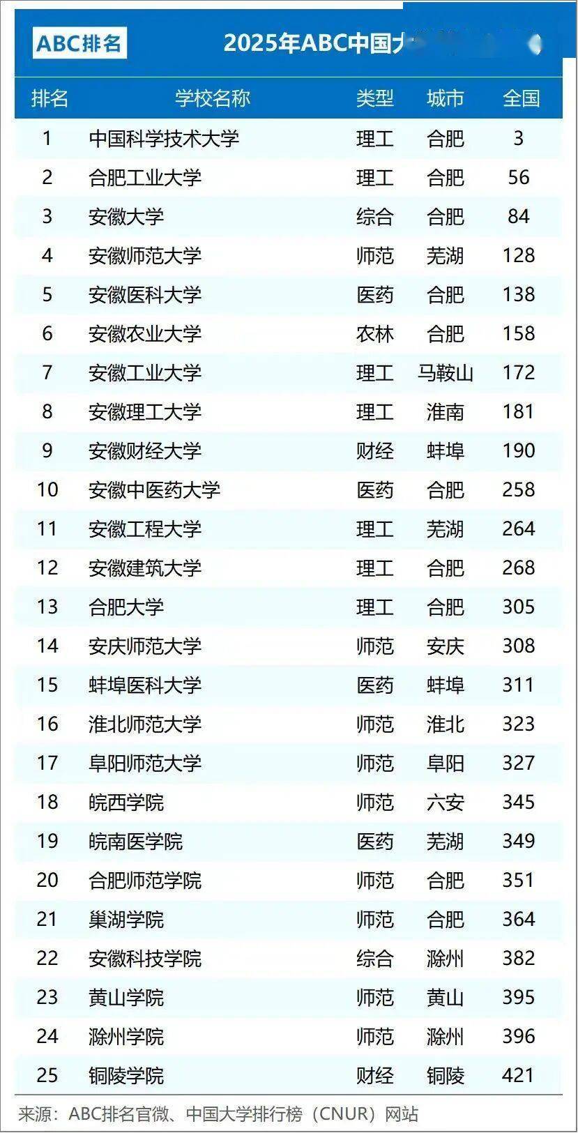 安徽师范大学第四,排在全国总榜第128名;安徽医科大学第五,排在全国总榜第138名;安徽农业大学第六,排在全国总榜第158名;安徽工业大学第七,排在全国总榜第172名。