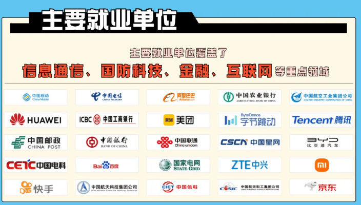 北邮是中国移动、中国电信、中国联通三大运营商最主要的人才基地和拔尖人才的摇篮,毕业生主要就业单位包括华为、中兴、百度、腾讯、阿里巴巴、微软、IBM等知名信息科技企业,中国工商银行、中国农业银行、中国银行、中国建设银行、交通银行等金融机构,中国电子科技集团、中国航天科技集团等国防科技工业单位等,同时,北邮业生也深受工业与信息化部、外交部、公安部等中央和国家机关的青睐。