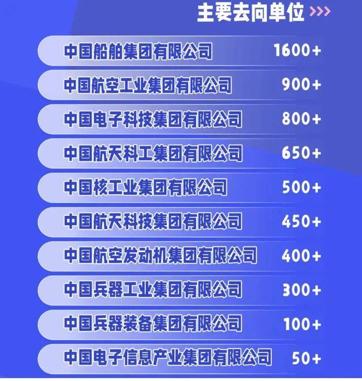哈尔滨工程大学2024届毕业生保持高位稳定,总体初次毕业去向落实率为94+%,毕业生投身国防科技工业领域就业比例为43+%,投身工业化、伟德国际娱乐信息化和国防现代化建设领域就业比例为75+%,毕业生签约世界500强及中国500强企业就业比例为47+%。近5年去往国防科技工业领域就业9221人,主要去向单位如下: