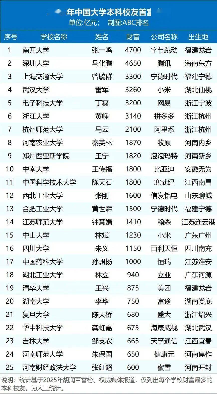 榜单中,共25所大学,排名基于2025年胡润百富榜、权威媒体报道,仅列出每个学校财富最多的本科校友。