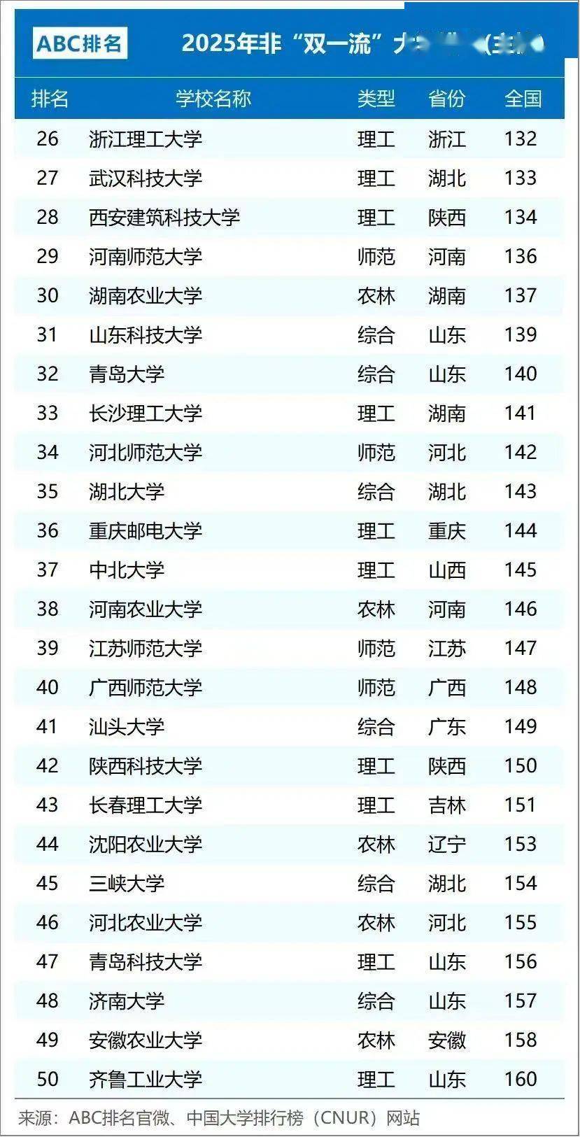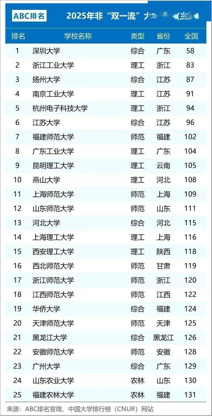 今天,来根据2025年ABC中国大学排名,看看我国双非一本大学的排名情况(仅罗列其中50强)。