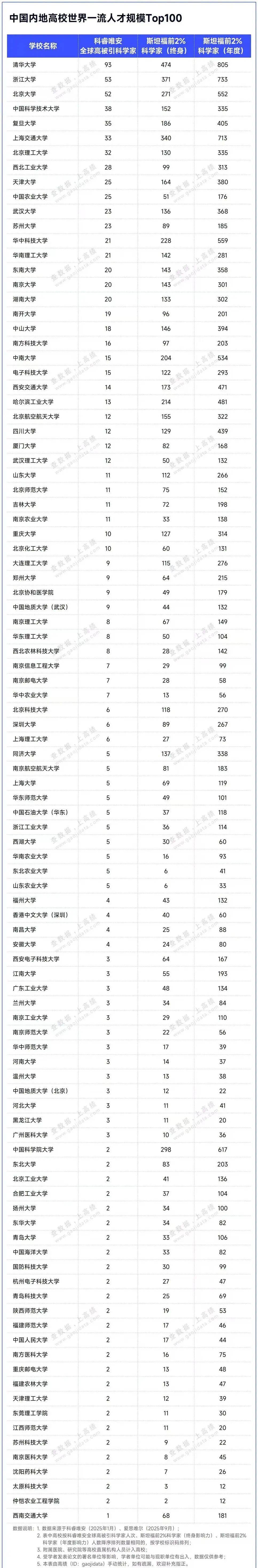 今天,通过排名机构“高绩”发布的榜单,来看看中国内地高校世界一流人才规模Top100。