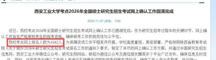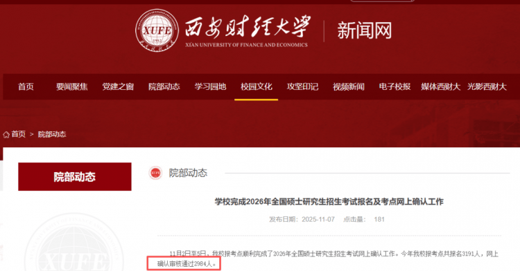 2、西安财经大学报考点共报名3191人,网上确认审核通过2984人,较去年减少了450人;2026年计划招收硕士研究生829人,比去年招生人数多了48人;
