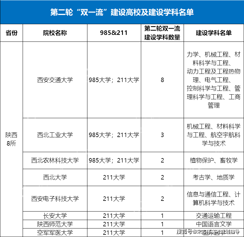 陕西省8所双一流高校中有7所在西安:分别是西安交通大学、西北工业大学、西安电子科技大学、西北大学、长安大学、陕西师范大学、空军军医大学。