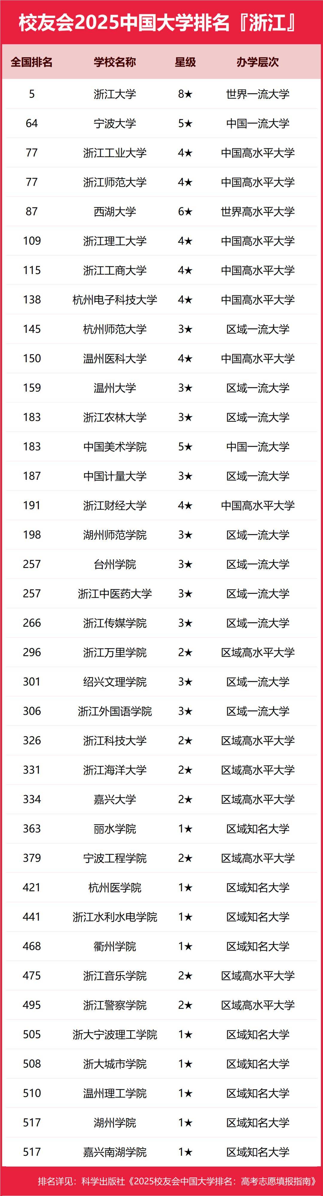 浙江省高校格局呈现群星璀璨之势:浙江大学稳居全国前五,以8星级荣膺世界一流大学;宁波大学作为省重点建设高校,以材料科学与工程等优势学科跻身全国64强;西湖大学以前沿科研生态跃居第87名;浙江师范大学、浙江工商大学等十余所院校凭借特色学科持续提升竞争力,形成多层级发伟德国际victor1946展梯队。